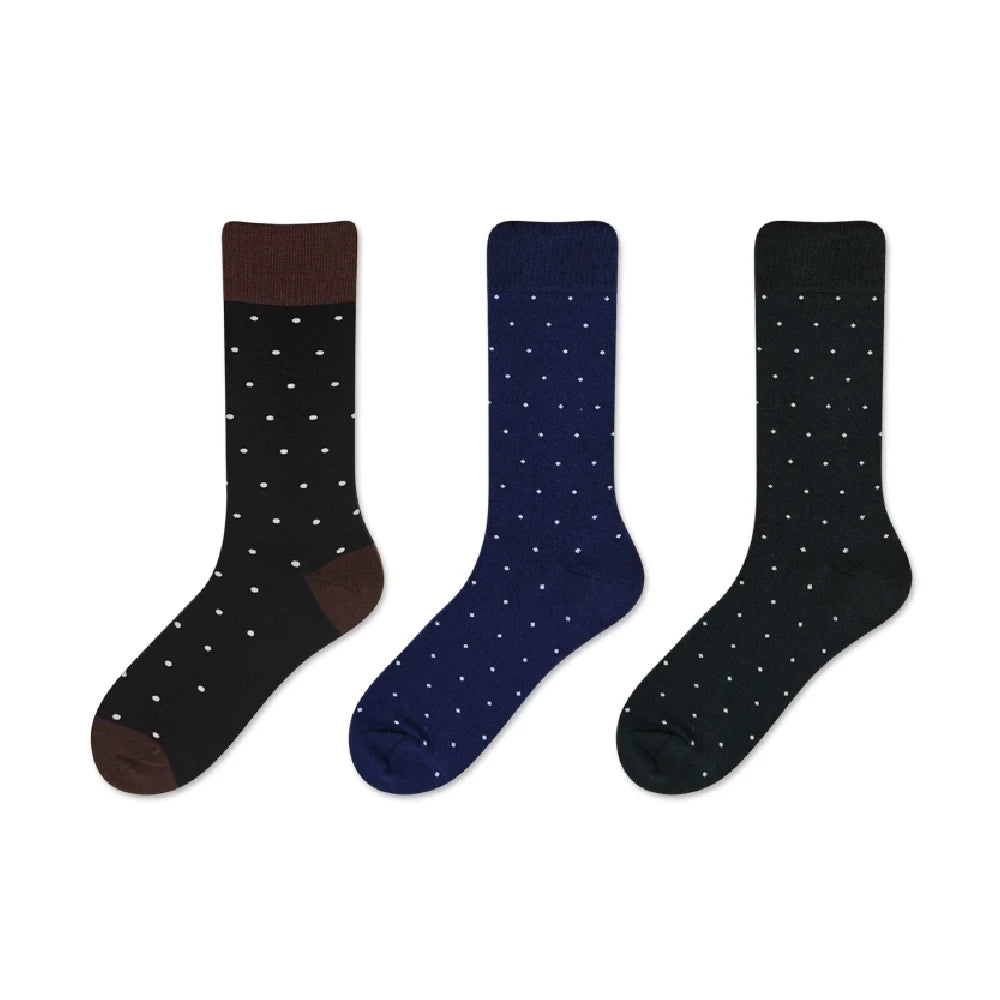 Pattern: Black, navy, and dark green socks with small white polka dots, classic casual style.