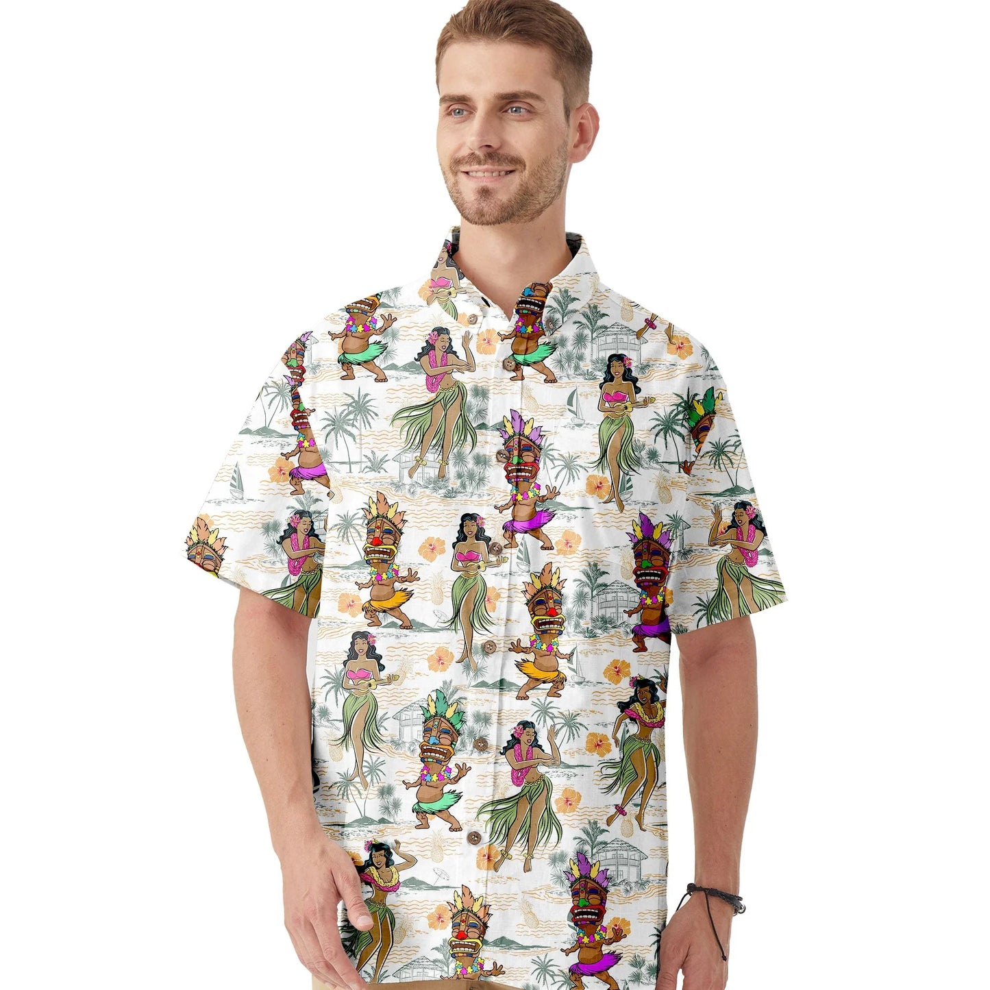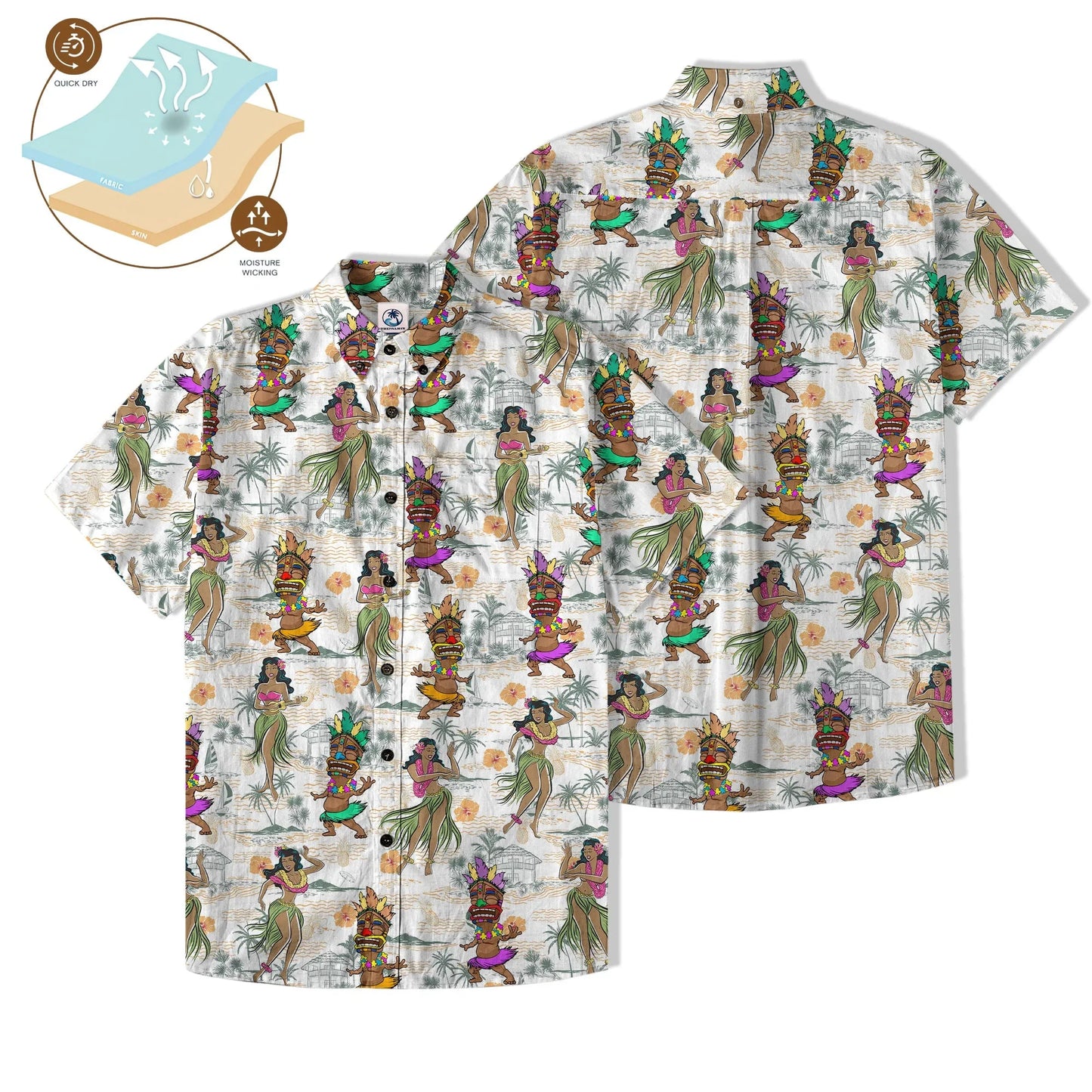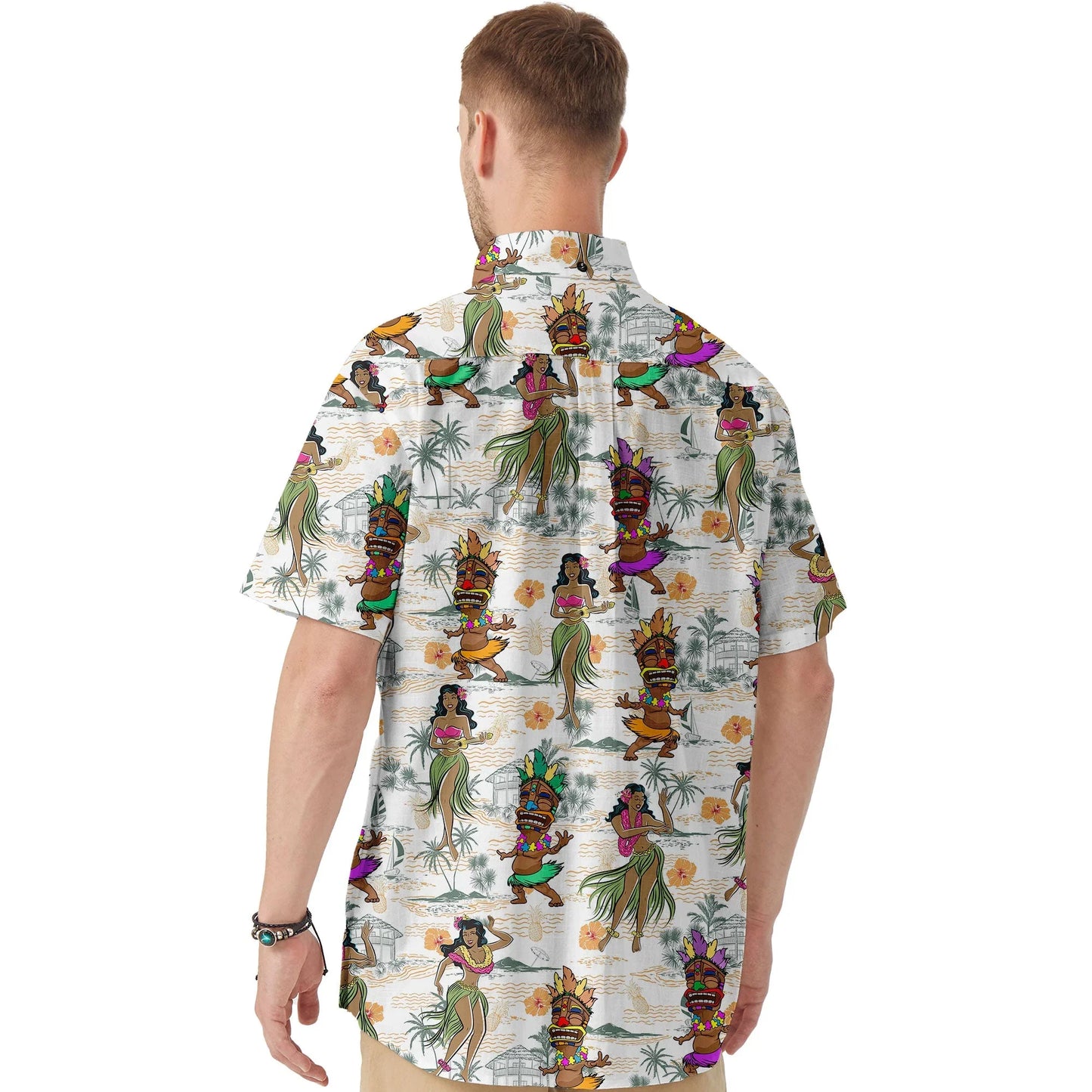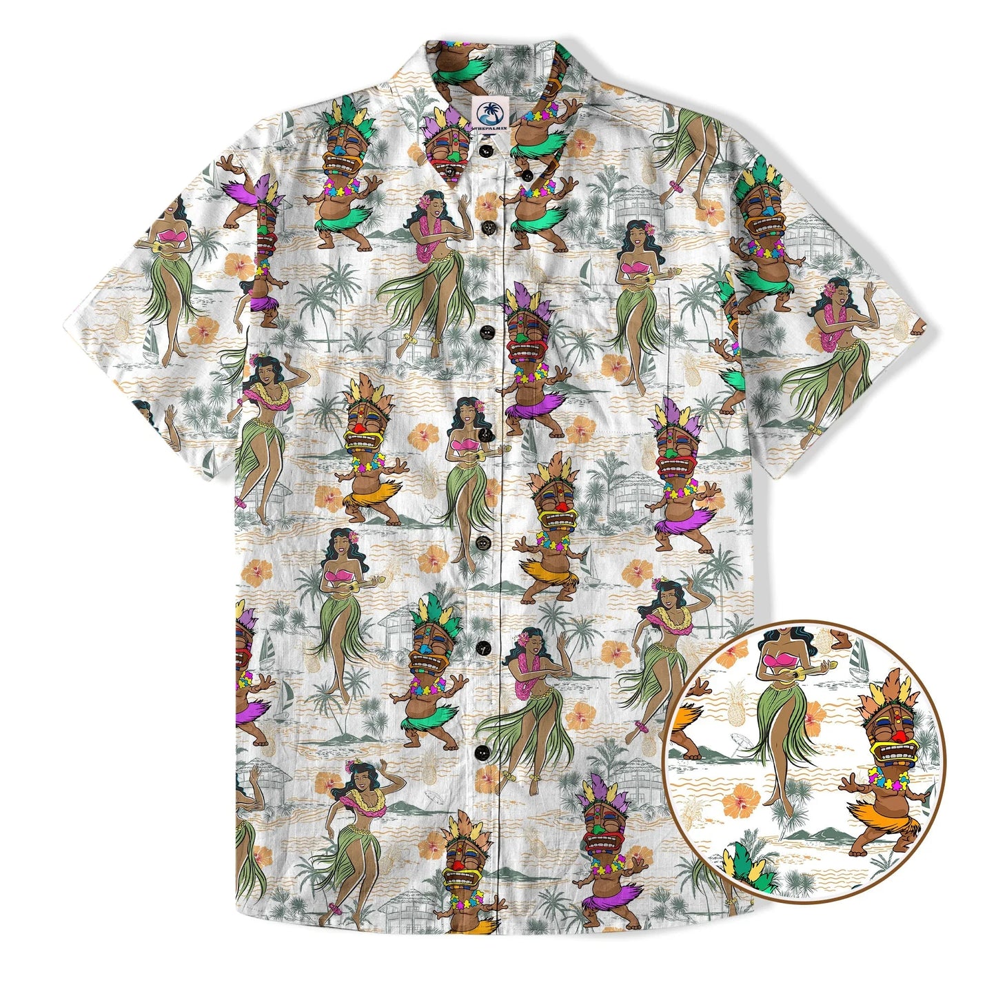 The detailed Tiki masks represent protection and good fortune. Meanwhile, the floral patterns evoke the laid-back charm of the beach. Together, they create a unique and stylish shirt that turns heads.
