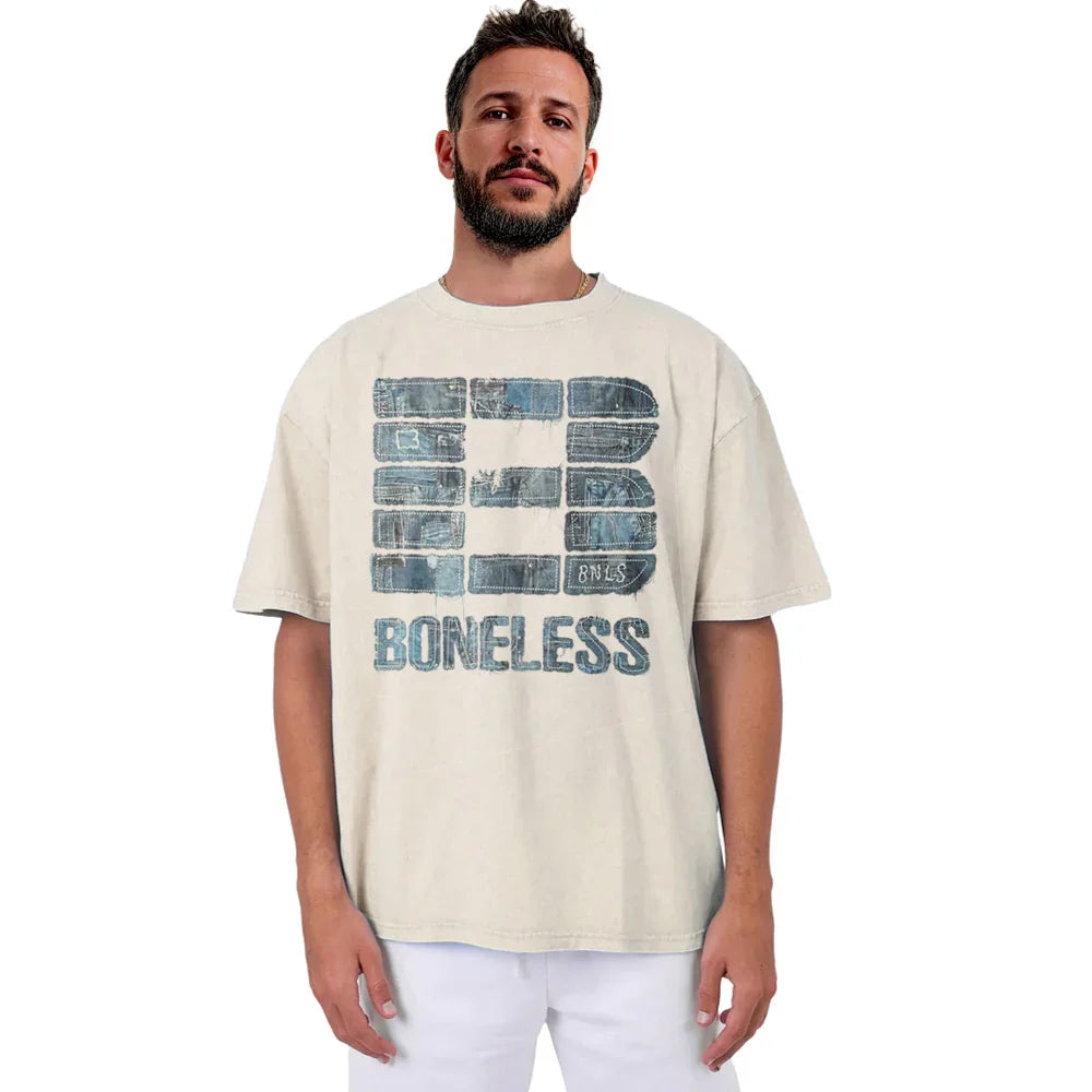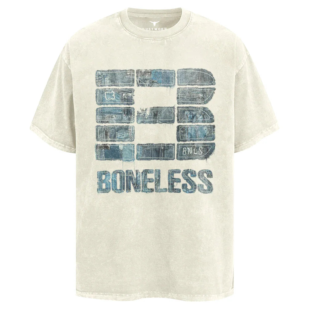 Pattern: Denim-patched “B” graphic with bold BONELESS lettering