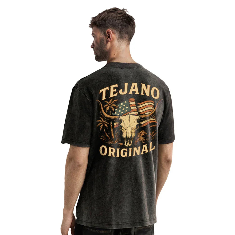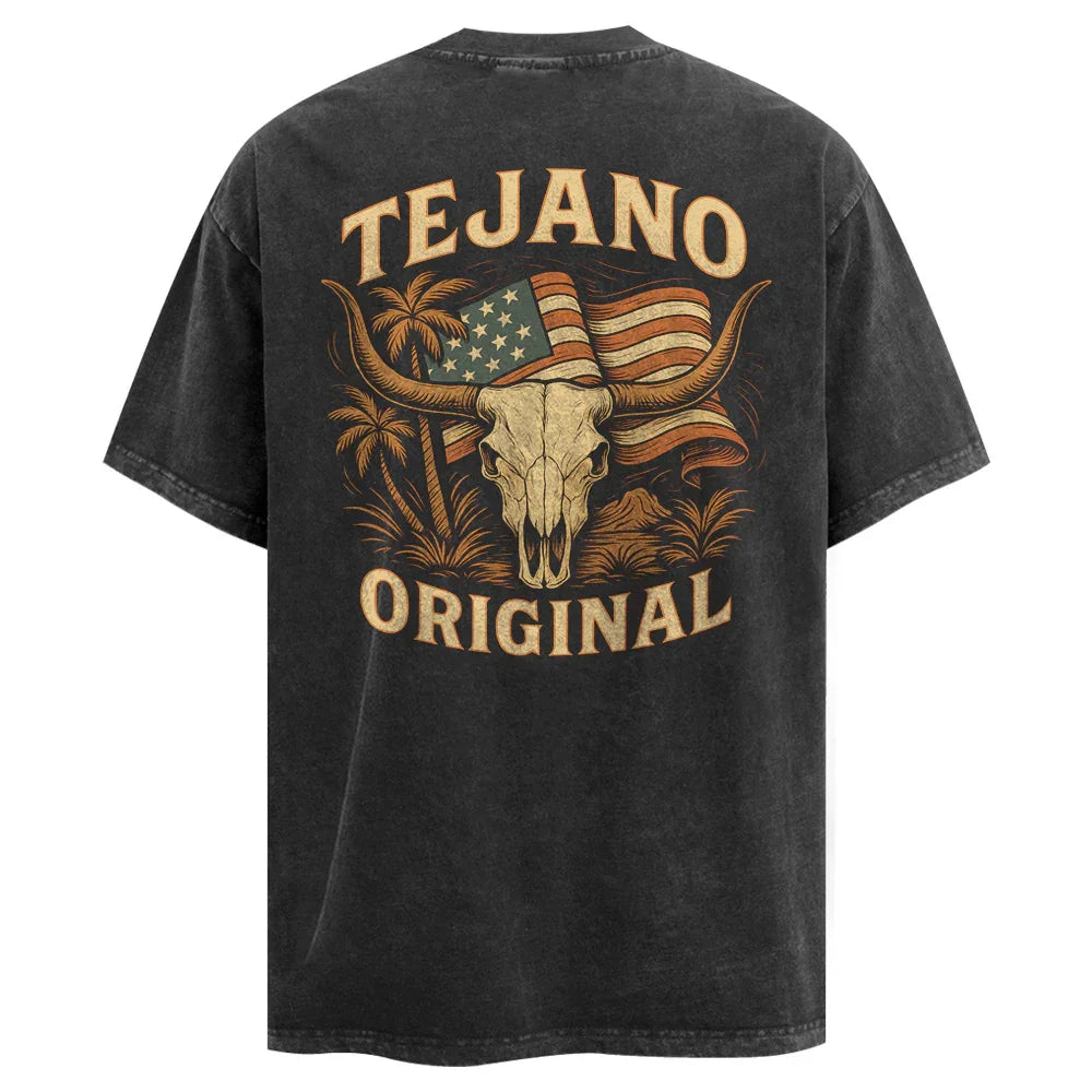Pattern: Longhorn skull, American flag, palm trees,"TEJANO", "ORIGINAL".