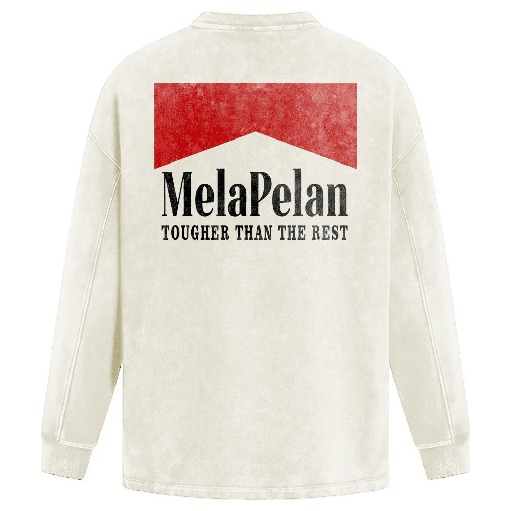 Pattern: A bold statement sweatshirt featuring the Dustworn Melapelan label design with a rugged vintage wash.
