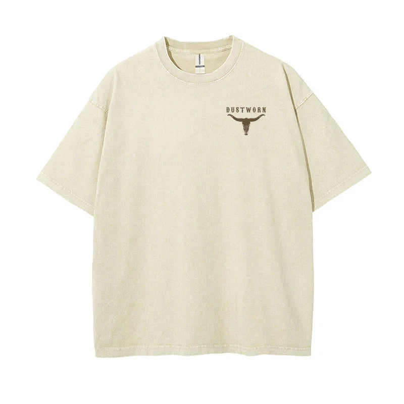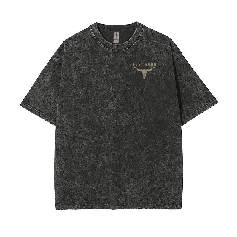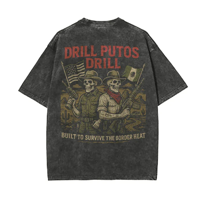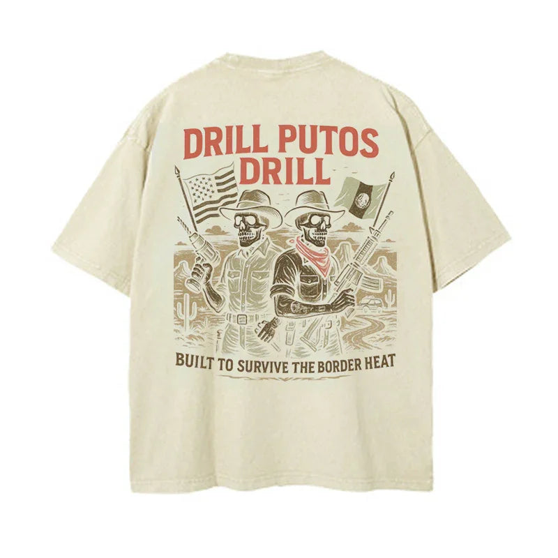 Pattern: "DRILL PUTOS DRILL" BUILT TO SURVIVE THE BORDER HEAT,Two skull - cowboy figures with flags and guns