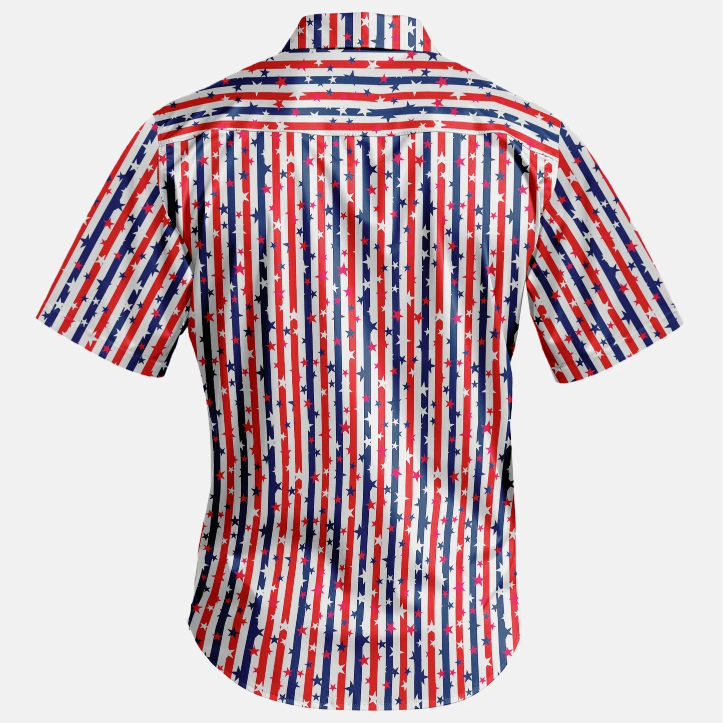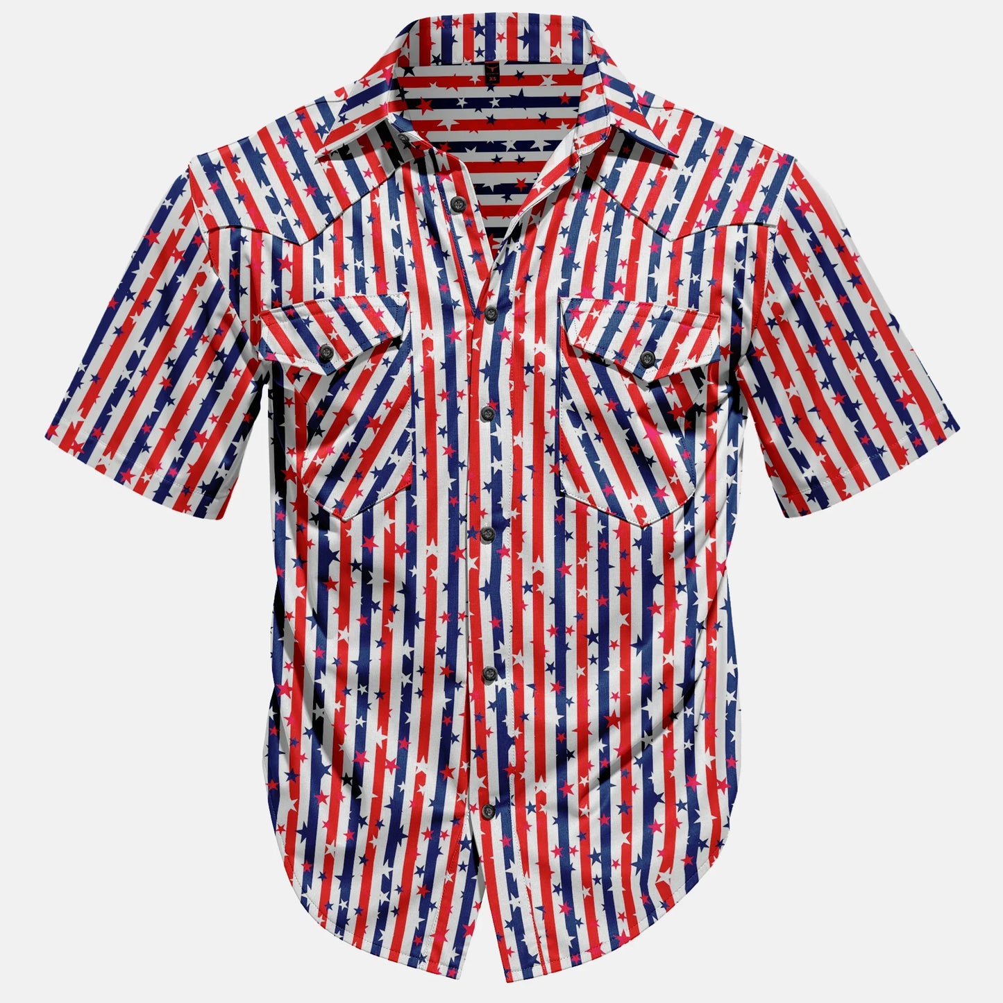 This men's short sleeve shirt features American flag elements with red, white, and blue stripes and star patterns, reflecting strong patriotism. The classic cowboy-style shirt design is perfect for various casual occasions, offering both style and personality. Whether for holiday celebrations or everyday wear, it will make you stand out.