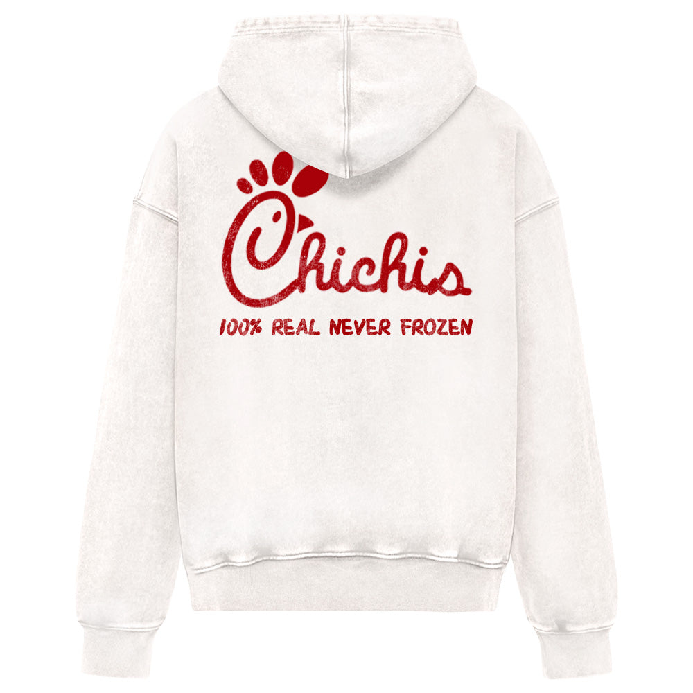 Pattern: Fun casual hoodie with “Chichis” logo and playful slogan.
