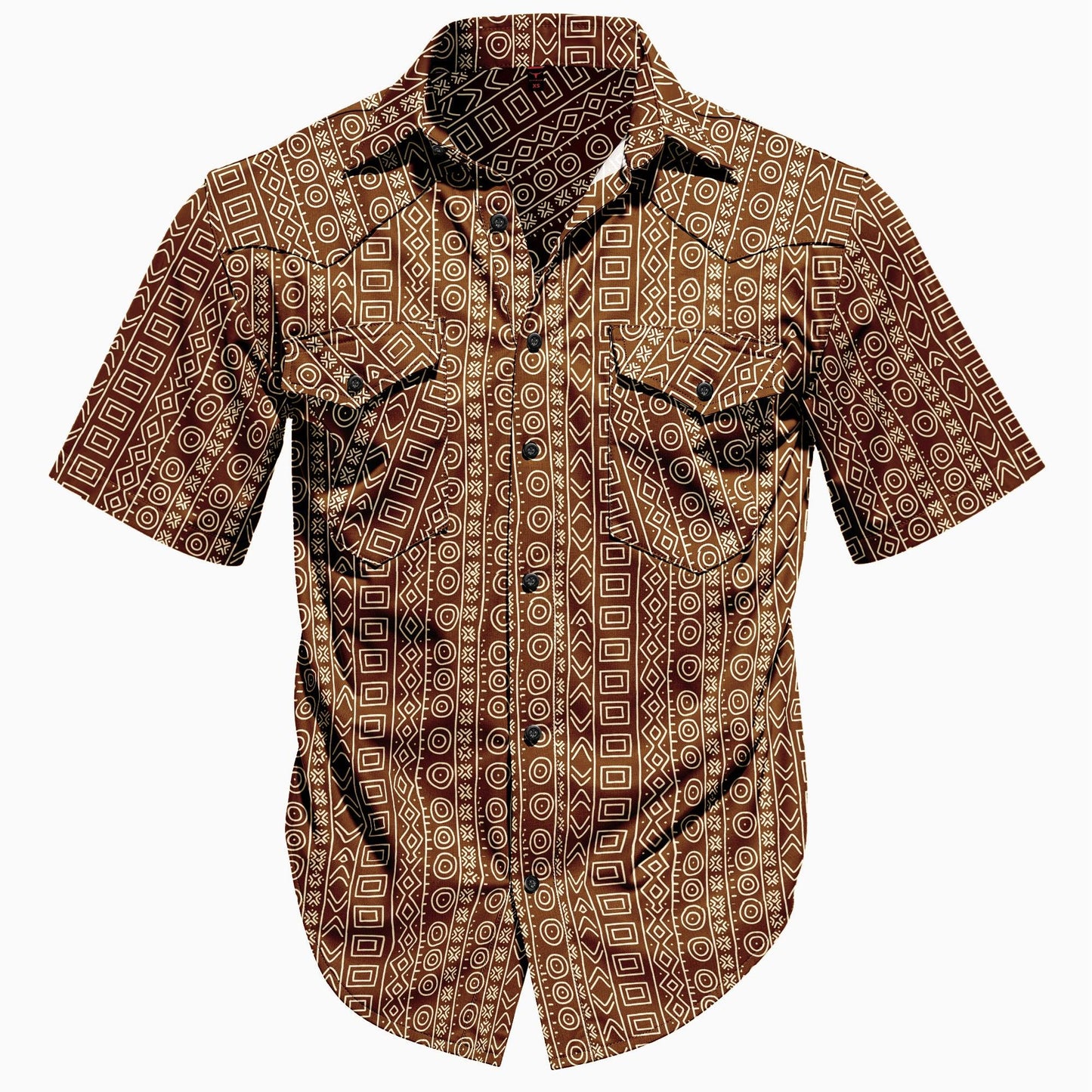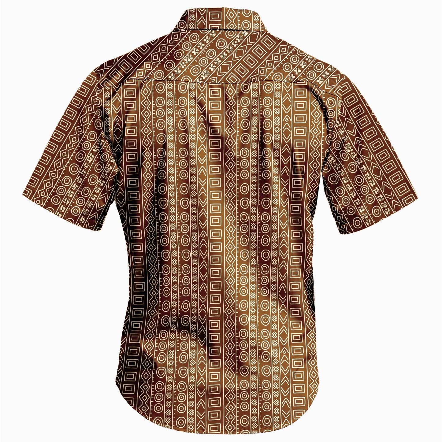 This short sleeve shirt features a geometric pattern in shades of brown and beige. The vertical arrangement of squares, diamonds, circles, and arrows evokes a bold ethnic rhythm and retro charm. The design channels both urban streetwear vibes. With functional chest pockets and a full button-up front, this shirt is perfect for everyday looks, parties, festivals, and vacation style.