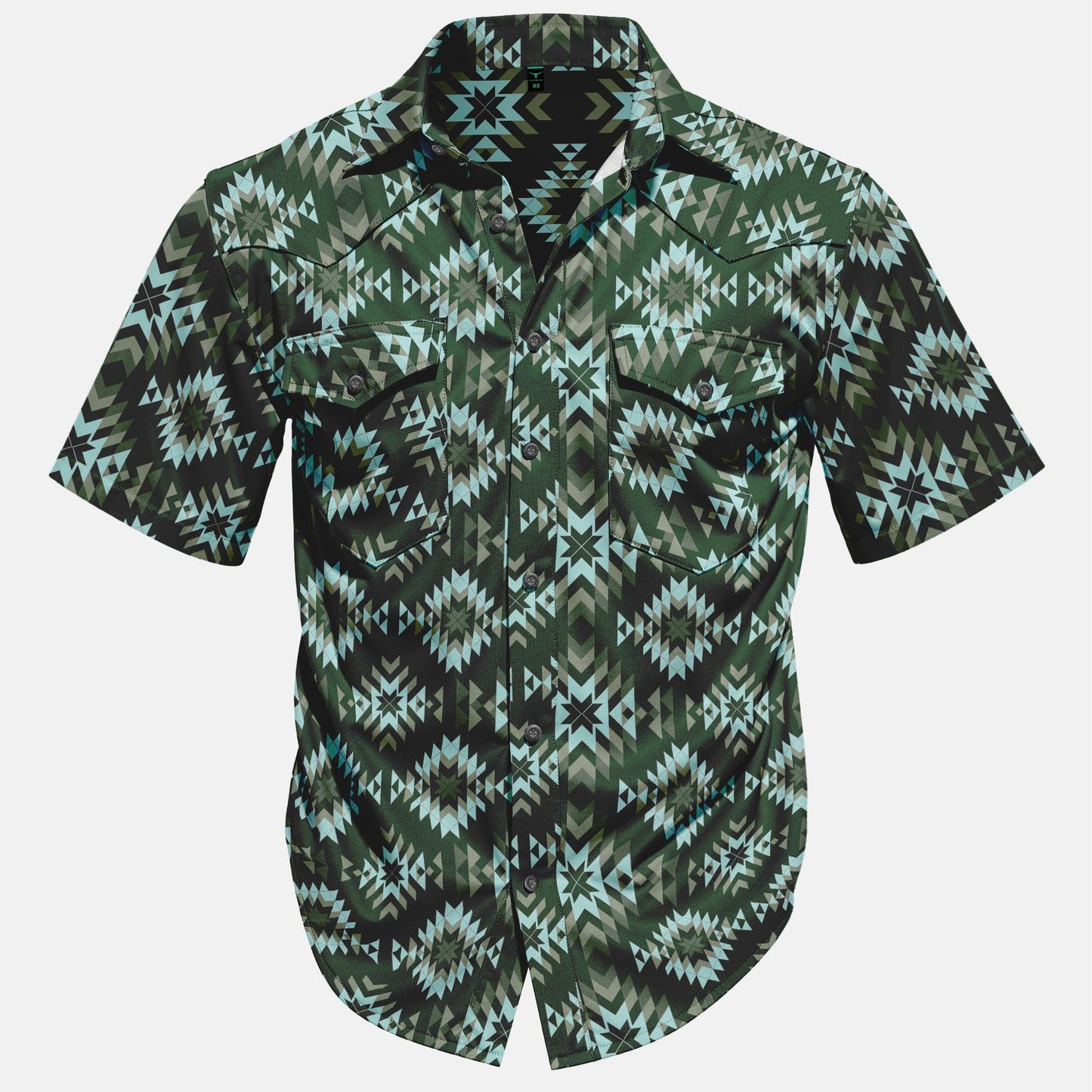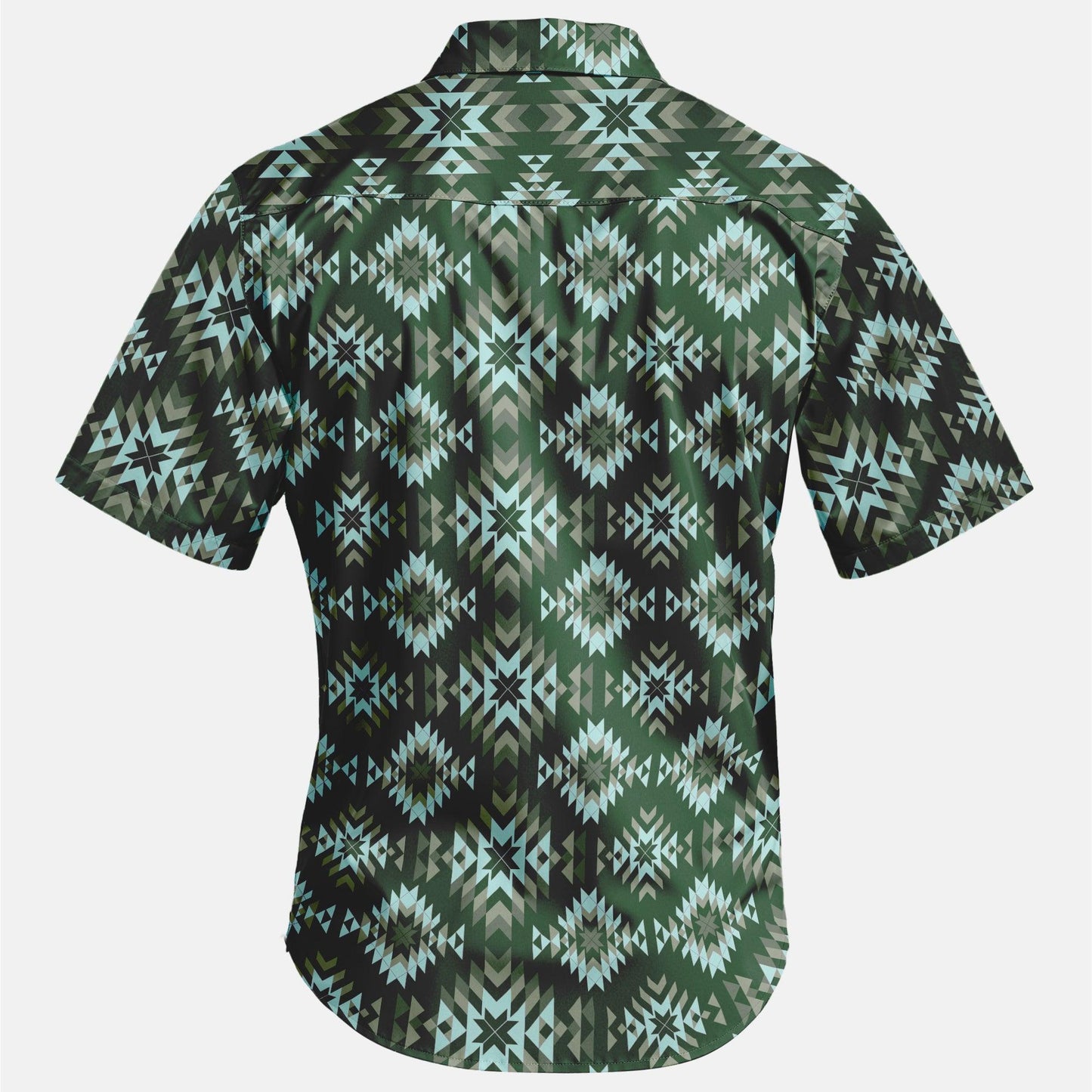 This short sleeve shirt showcases a bold tribal-inspired geometric print, featuring a palette of dark green, black, and light blue tones. The symmetrical, starburst-like patterns evoke a strong Southwestern vibe with a modern retro twist. Complete with dual chest pockets and a button-down front, it’s perfect for casual daily wear, music festivals, parties, or outdoor adventures—ideal for those who appreciate both tribal aesthetics and functional fashion.