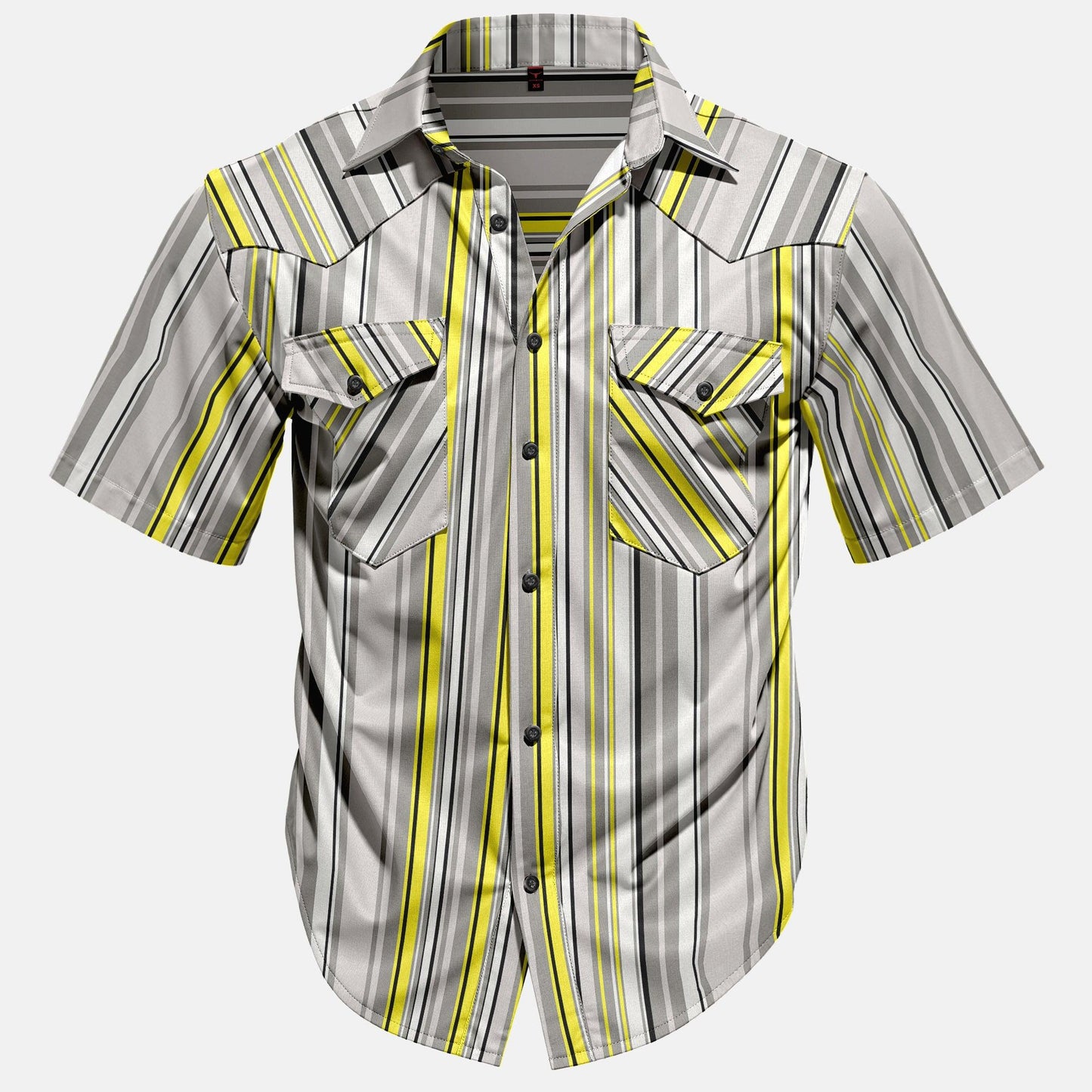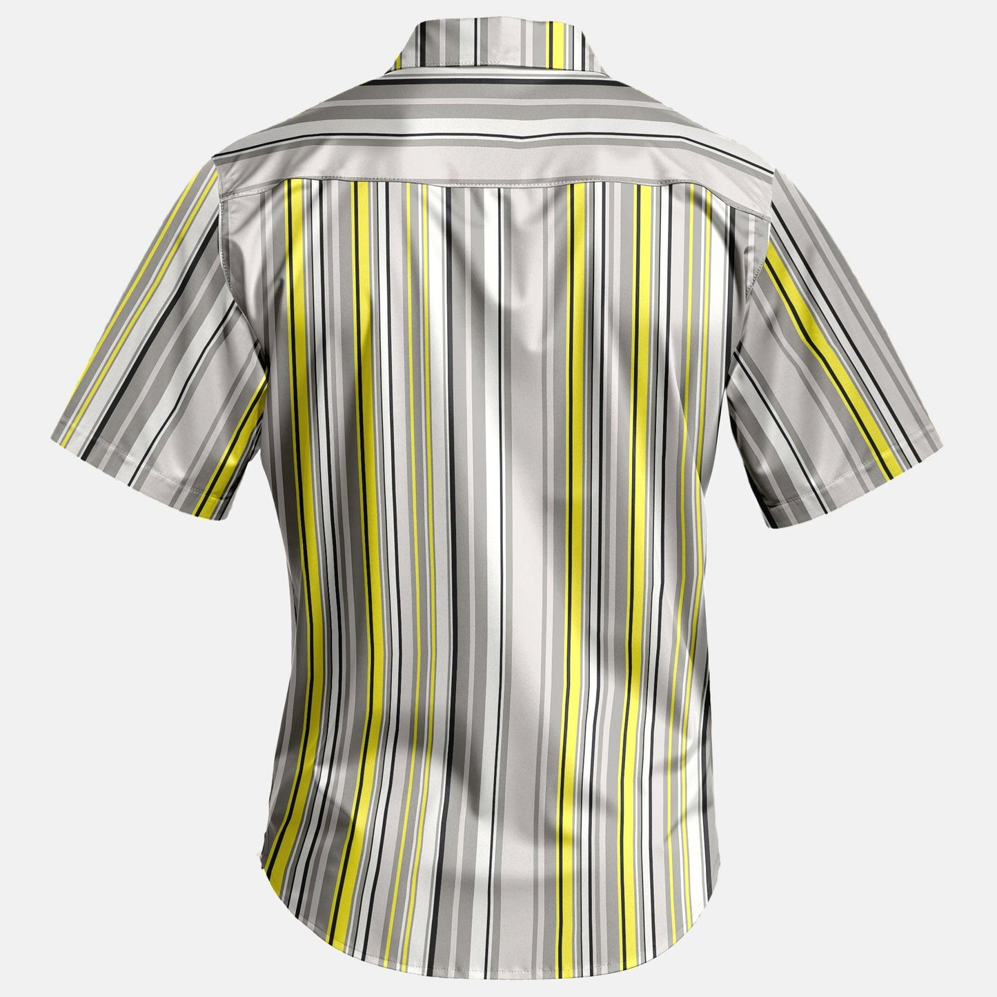 This short sleeve shirt features a crisp and energetic vertical stripe design in shades of yellow, gray, black, and white. The colorblock stripes offer a modern take on retro style, with angled chest pocket stripes adding a sharp geometric twist. Clean, bold, and confident—this shirt is ideal for summer city wear, festival fashion, or statement street looks.