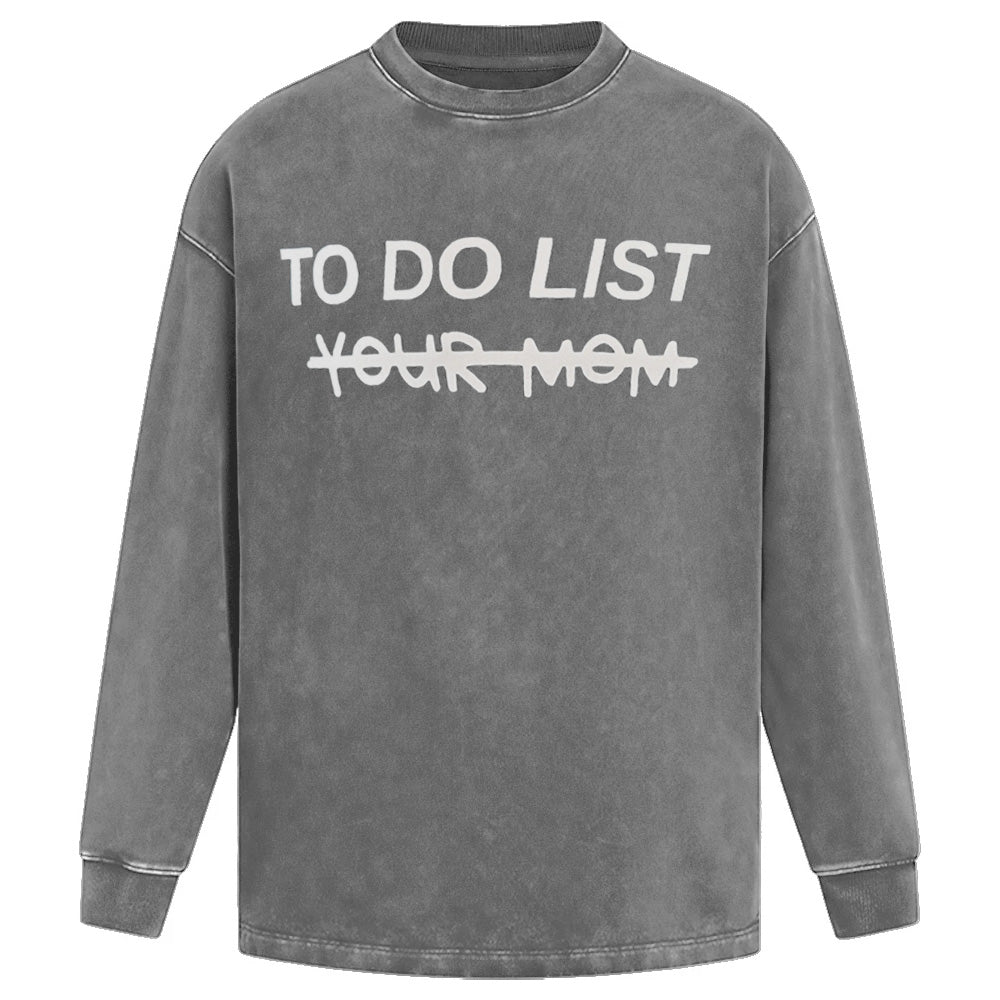 Pattern: A bold and funny sweatshirt with cheeky “To Do List – Your Mom” text. Vintage washed finish.